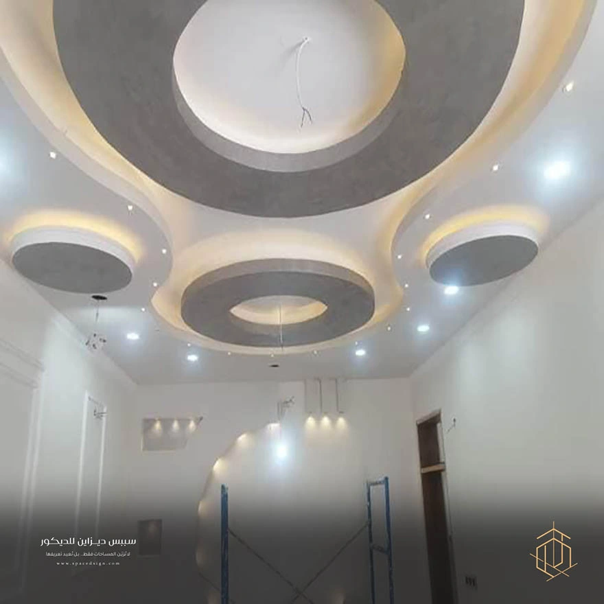 • أسقف جبس بورد دوائر: تضيف لمسة هندسية ناعمة، وتستخدم غالبًا لإبراز منتصف السقف وتنسيق وحدات الإضاءة بشكل جذاب.